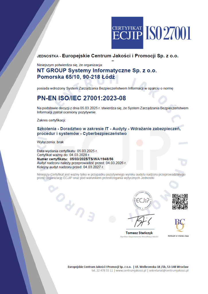 Miło nam poinformować, że NT GROUP Systemy Informatyczne pomyślnie przeszła audyt i uzyskała certyfikację ISO/IEC 27001:2023-08.